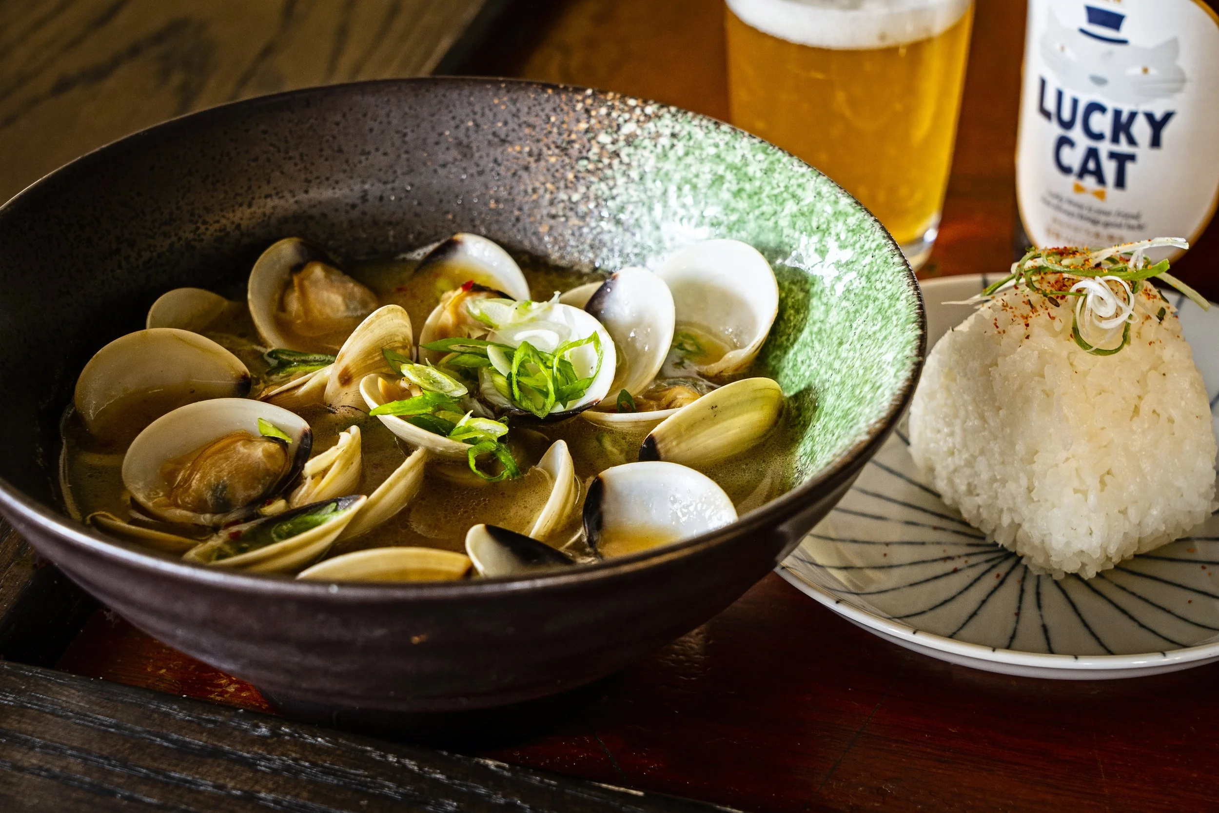 It was inspired by a memory of my father, who used to eat a bowl of rice with a little butter and a side of miso soup. It wasn’t the traditional or “polite” way to eat it in Japan, but I loved the combination of flavors. That memory inspired a broth made with dashi, miso, butter, garlic, and red chili, with clams simmered in it. We serve it with a rice ball and encourage guests to enjoy the clams first, then drop the rice into the leftover broth—just like my dad did. It’s deeply personal and full of comfort.